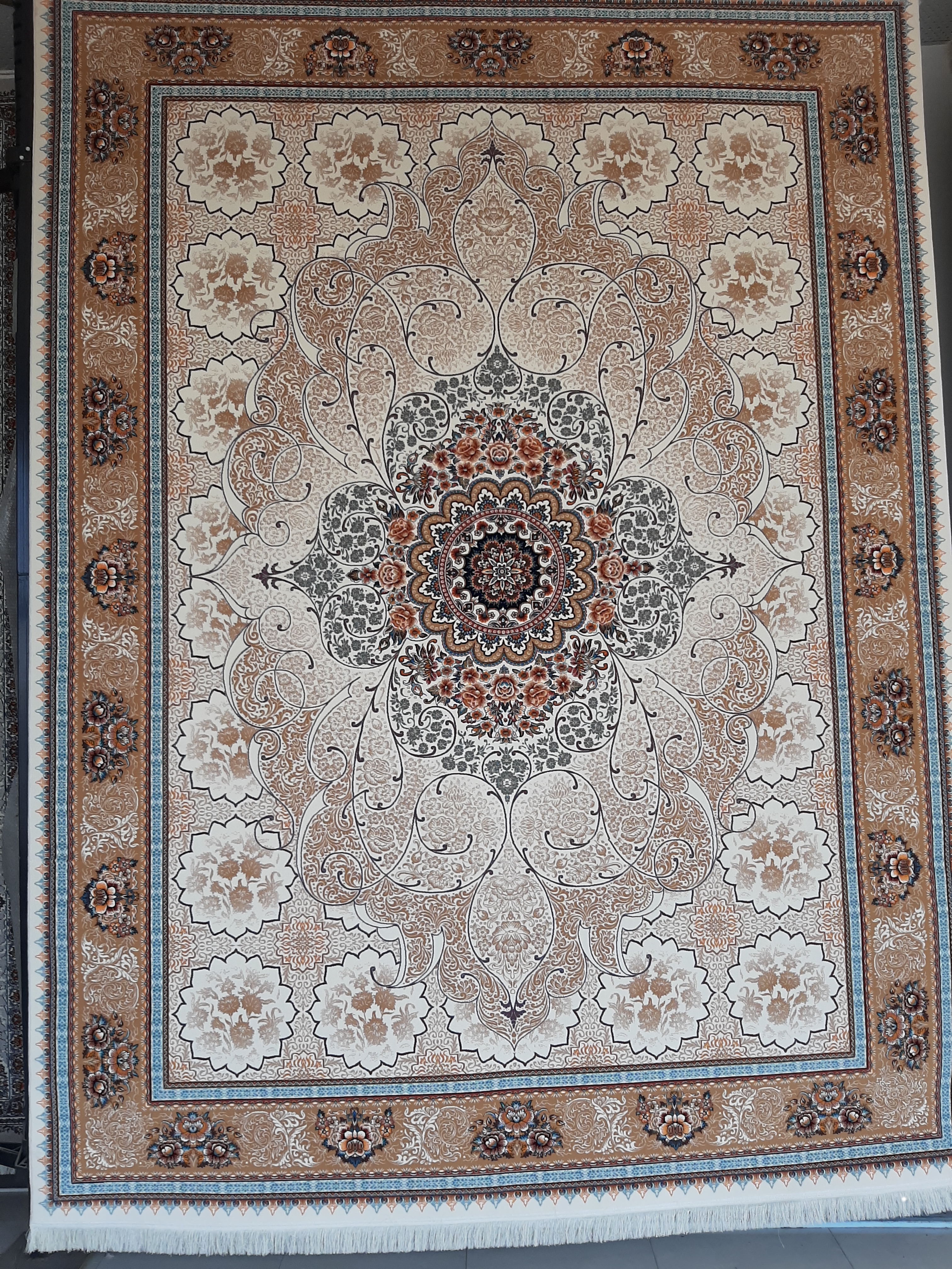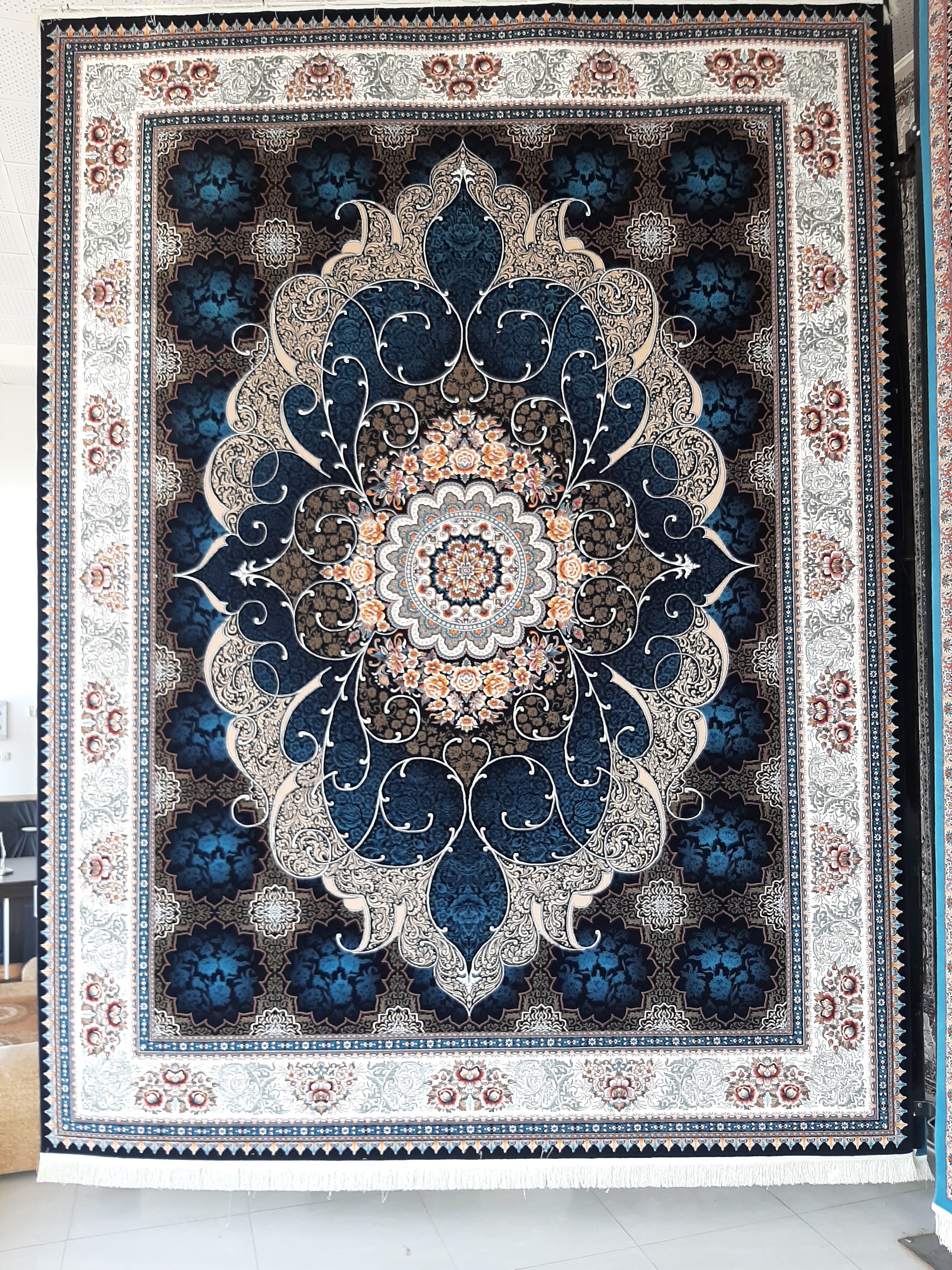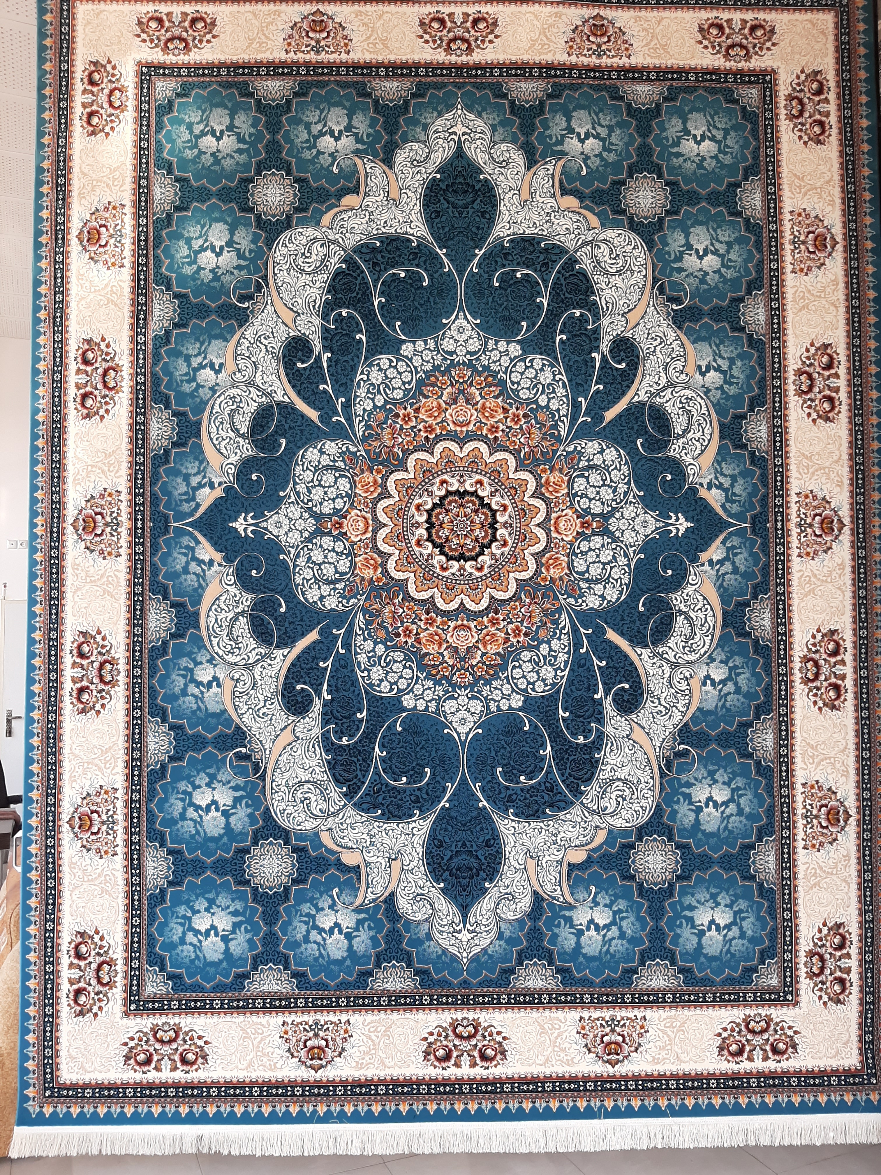 فرش ماشینی ۷۰۰ شانه اصل تراکم ۲۵۵۰ هشت رنگ، نقشه چکاوک، صددرصد نخ اکرولیک هیت ست شده با ۶۰ ماه ضمانت کیفیت و ضمانت مرجوعی کیفیت، بسیار باکیفیت، وزن ۱۲ متری محصول ۴۰ کیلوگرم می باشد. با ضمانت اتوی داغ، بافت در ۳ رنگ متنوع زمینه، فیلی - سرمه ای- کرم -آبی، ارسال پس کرایه