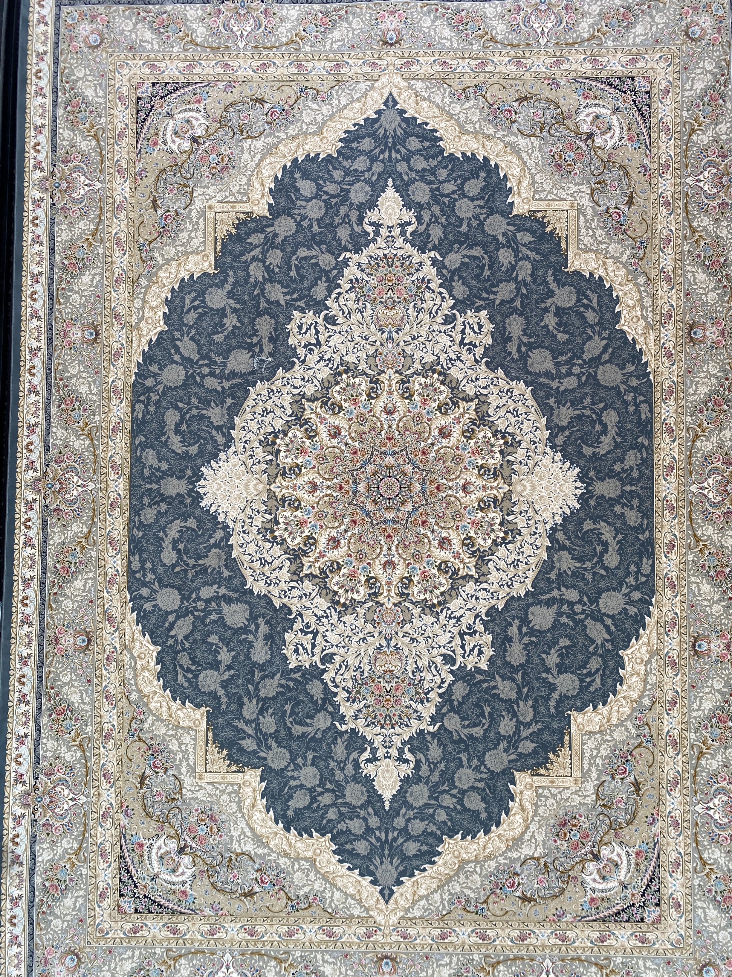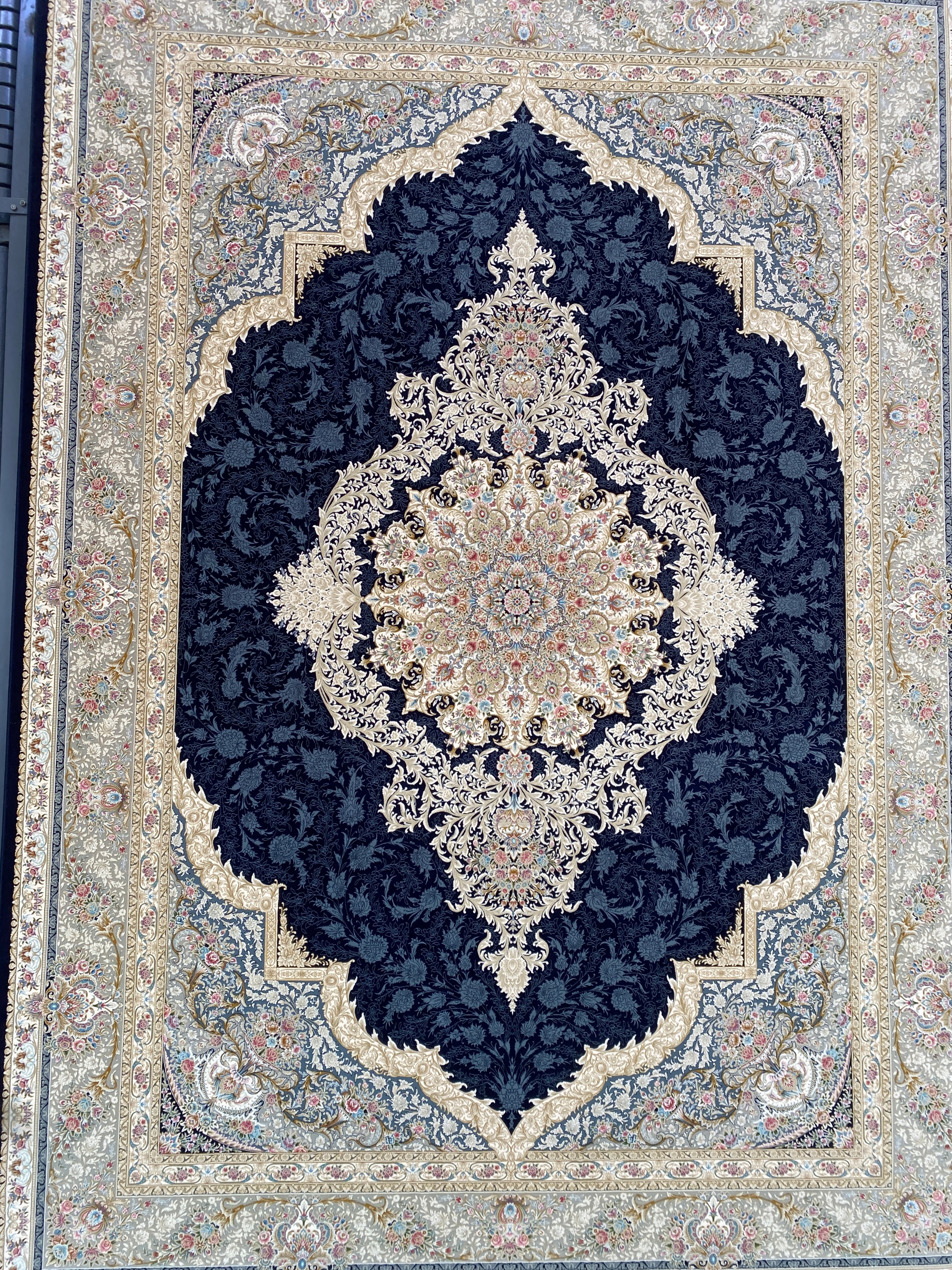 فرش ماشینی 1500 شانه اصل تراکم 4500 برجسته، اورجینال 10 رنگ، نقشه کد 8807 ، صددرصد نخ ترک با ۶۰ ماه ضمانت کیفیت و ضمانت مرجوعی کیفیت، بسیار باکیفیت، بافت با رنگ های متنوع زمینه، مشکی سرمه ای- نقره ای - دلفینی، ارسال پس کرایه
