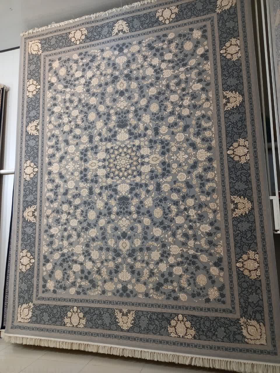 فرش ماشینی ۷۰۰ شانه اصل تراکم ۲۵۵۰ هشت رنگ، نقشه افشان طلاکوب ، صددرصد نخ اکرولیک هیت ست شده شماره ۲۳ ( نخ به کار رفته در این فرش نخ فرش 1200 شانه است)، با ۶۰ ماه ضمانت کیفیت و ضمانت مرجوعی کیفیت، بسیار باکیفیت، با ضمانت اتوی داغ، بافت با رنگ های متنوع زمینه، فیلی - دودی - نقره ای، ارسال پس کرایه
