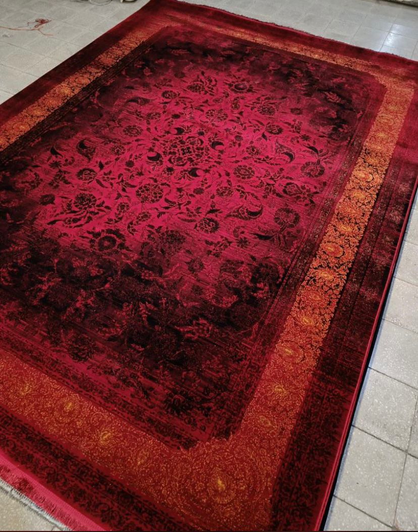 فرش ماشینی ۷۰۰ شانه اصل تراکم ۲۵۵۰ هشت رنگ نقشه آسمان لاکی صددرصد نخ اکرولیک هیت ست شده با ۶۰ ماه ضمانت کیفیت و ضمانت مرجوعی کیفیت، بسیار باکیفیت، با ضمانت اتوی داغ، ضخامت فرش 9 میلیمتر، بافت در تمامی ابعاد با رنگ زمینه: لاکی ، ارسال پس کرایه
