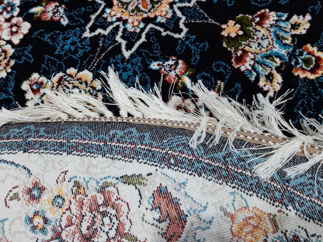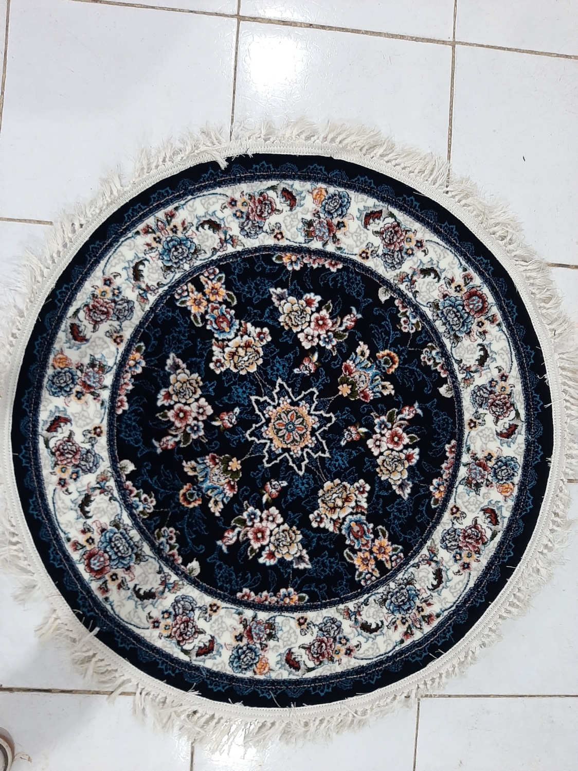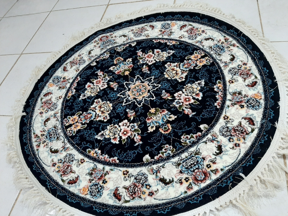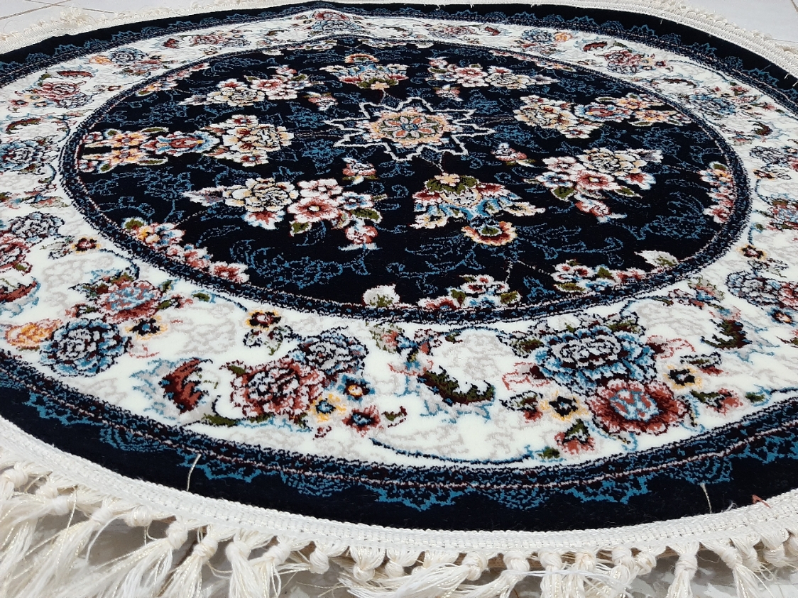 قالیچه دایره فرش ماشینی با قطر یک متر ۷۰۰ شانه اصل گلپری سرمه ای با تراکم ۲۱۰۰ صددرصد نخ اکرولیک هیت ست شده با ۶۰ ماه ضمانت کیفیت، ارسال پس کرایه