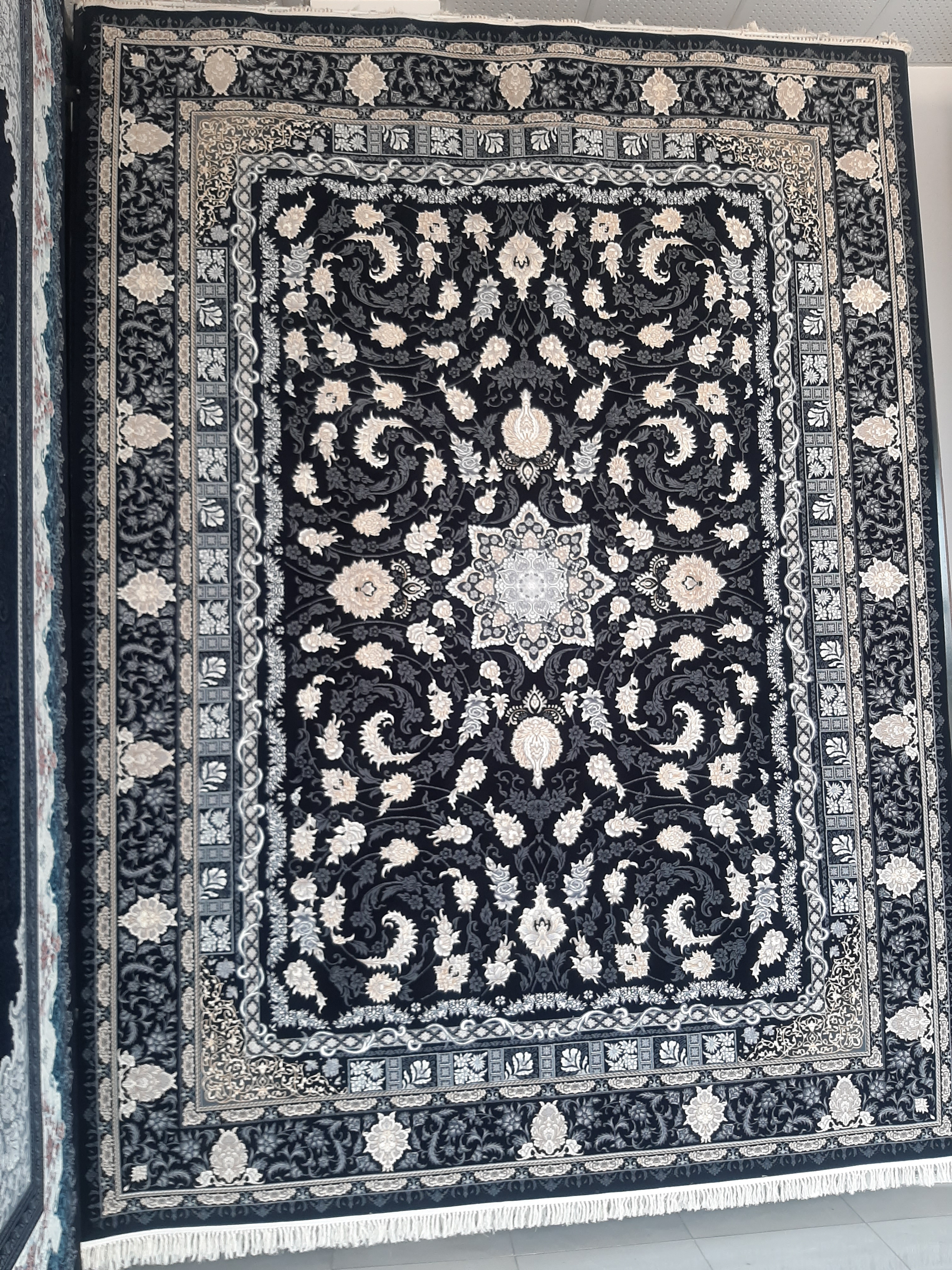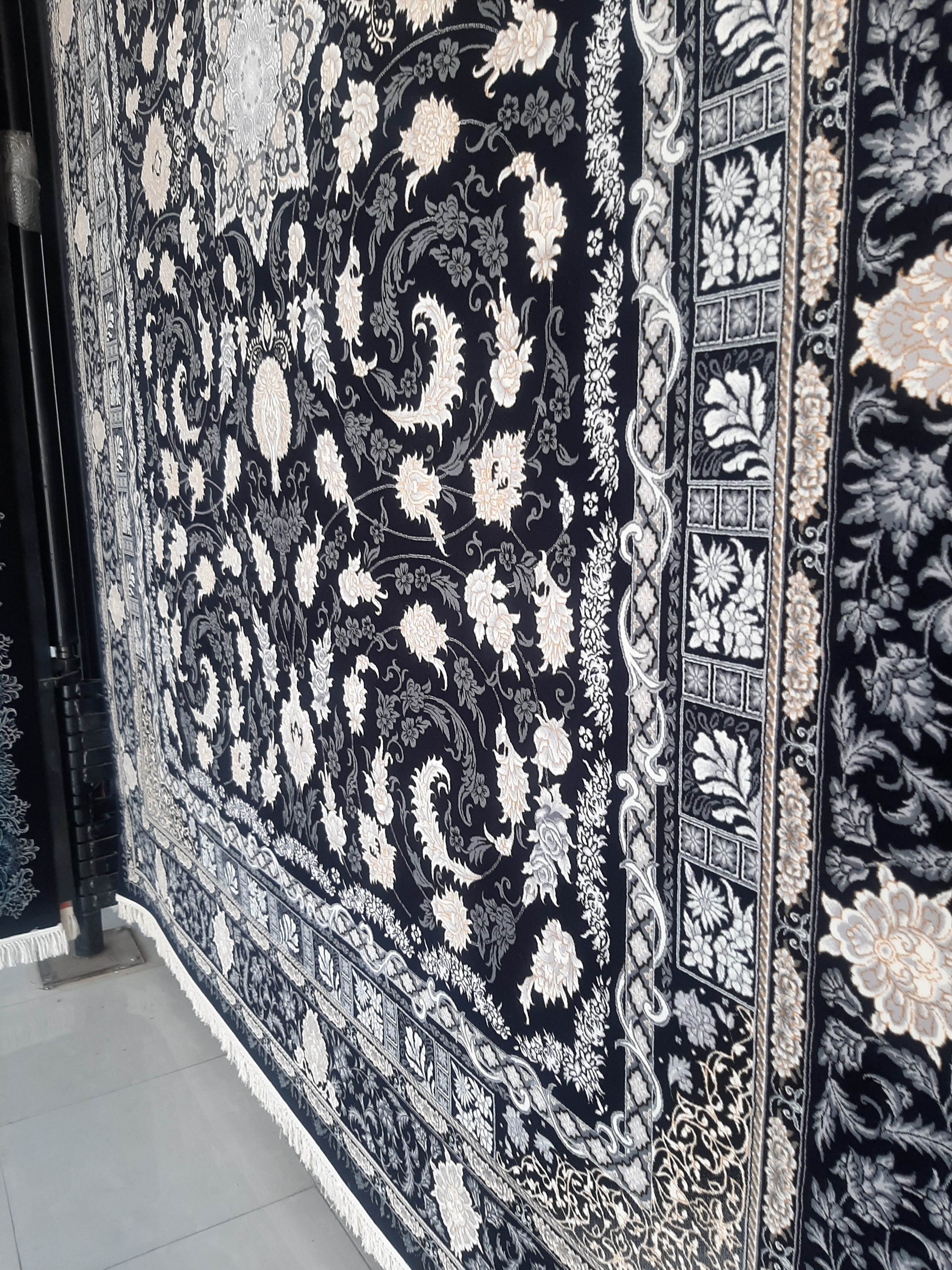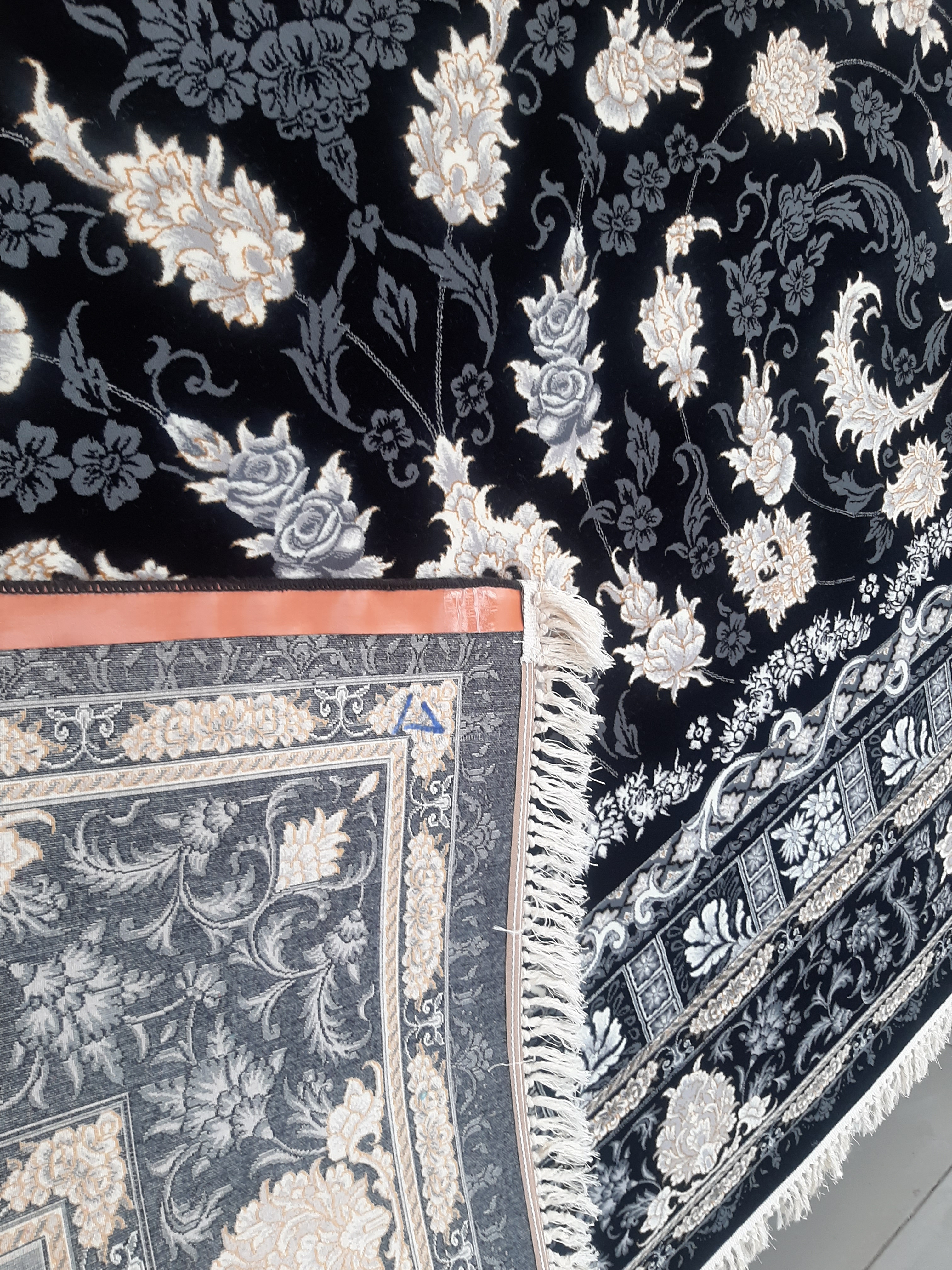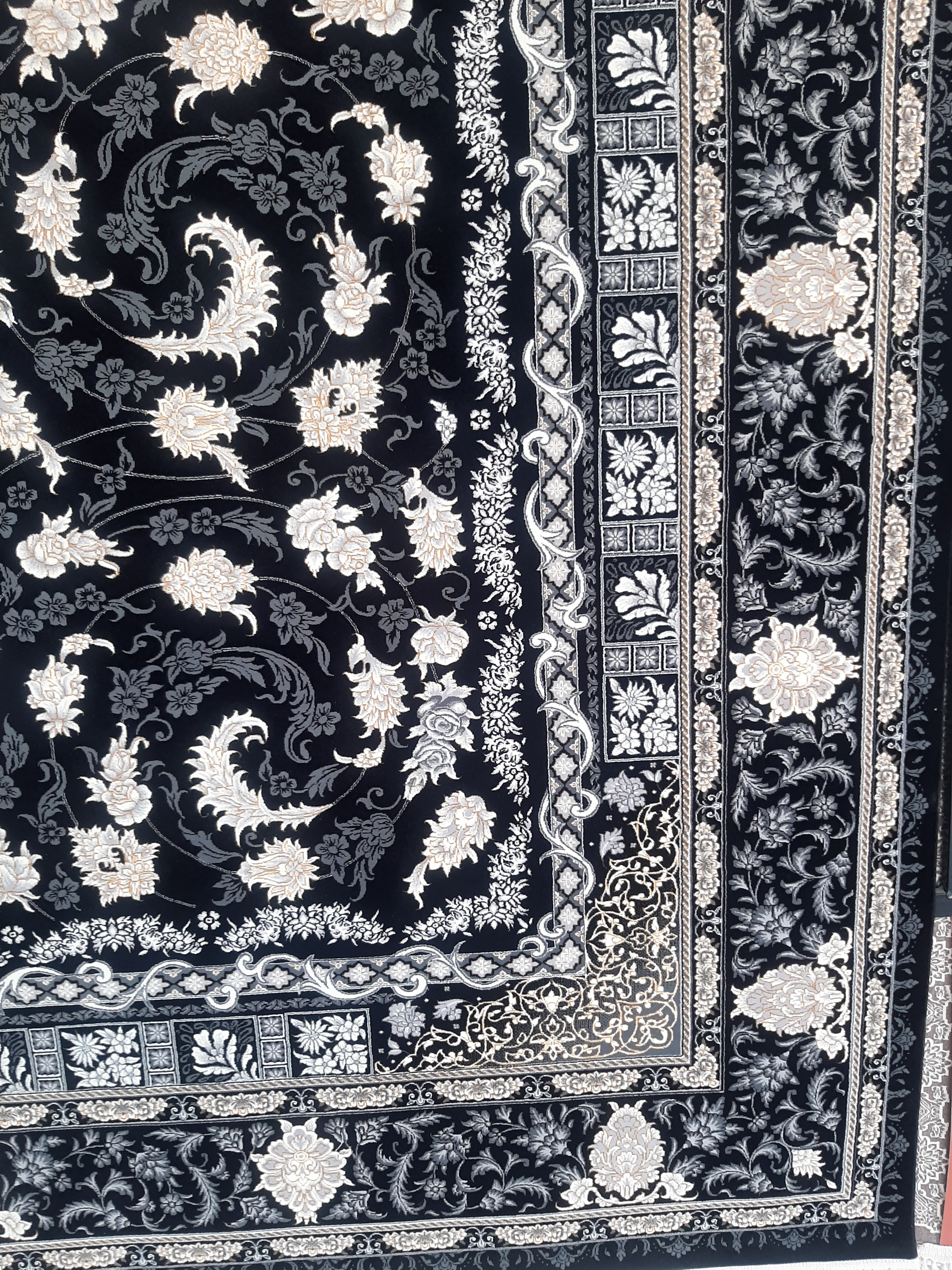 فرش ماشینی ۷۰۰ شانه اصل تراکم ۲۵۵۰ هشت رنگ، صددرصد نخ اکریلیک هیت ست شده با ۶۰ ماه ضمانت کیفیت و ضمانت مرجوعی کیفیت، نقشه دایان مشکی سرمه ای، بسیار باکیفیت، وزن ۱۲ متری محصول ۴۰ کیلوگرم می باشد. با ضمانت اتوی داغ، بافت hcpx2 رنگ متنوع زمینه: دودی- فیلی - مشکی سرمه ای، ارسال پس کرایه