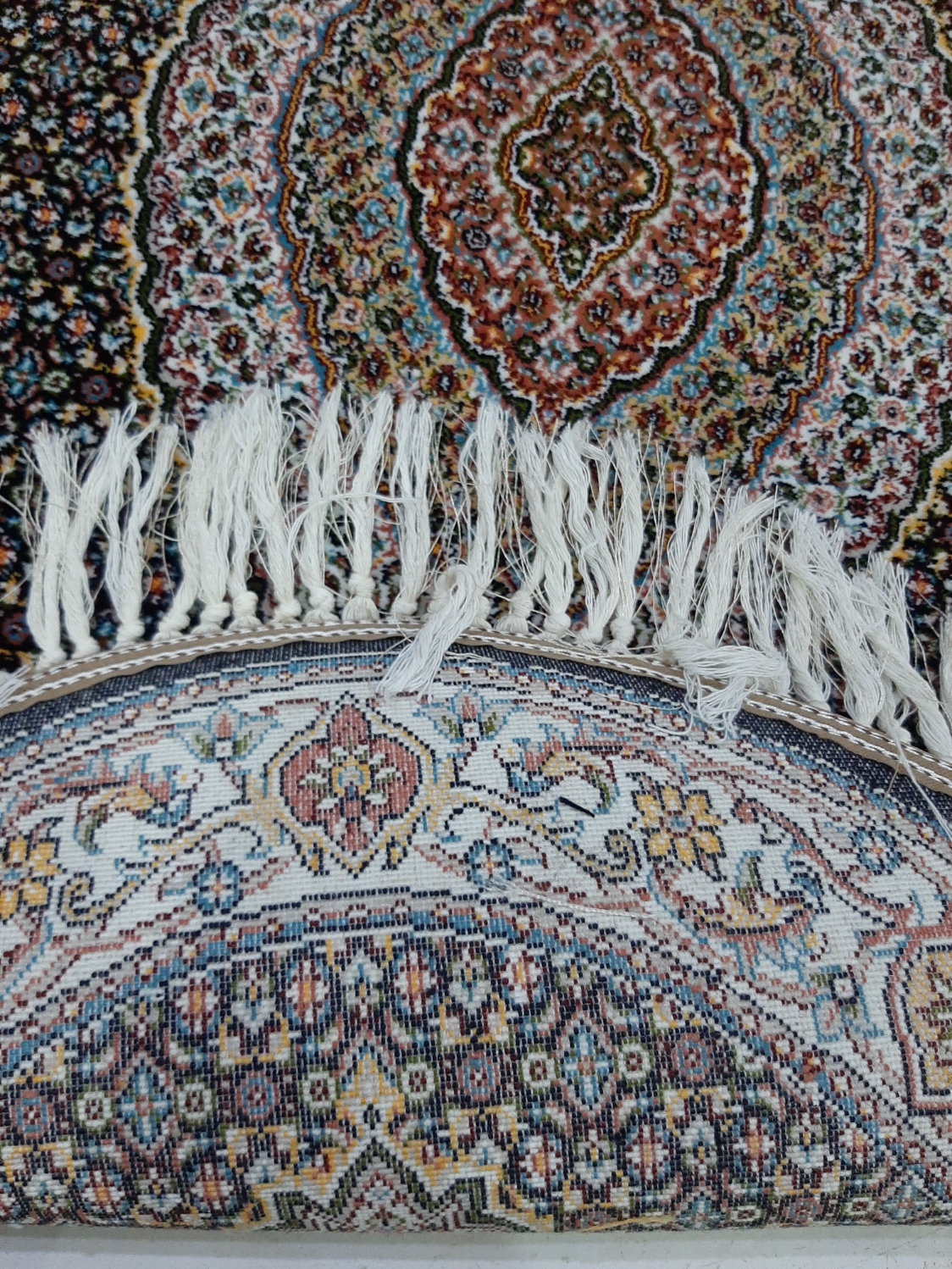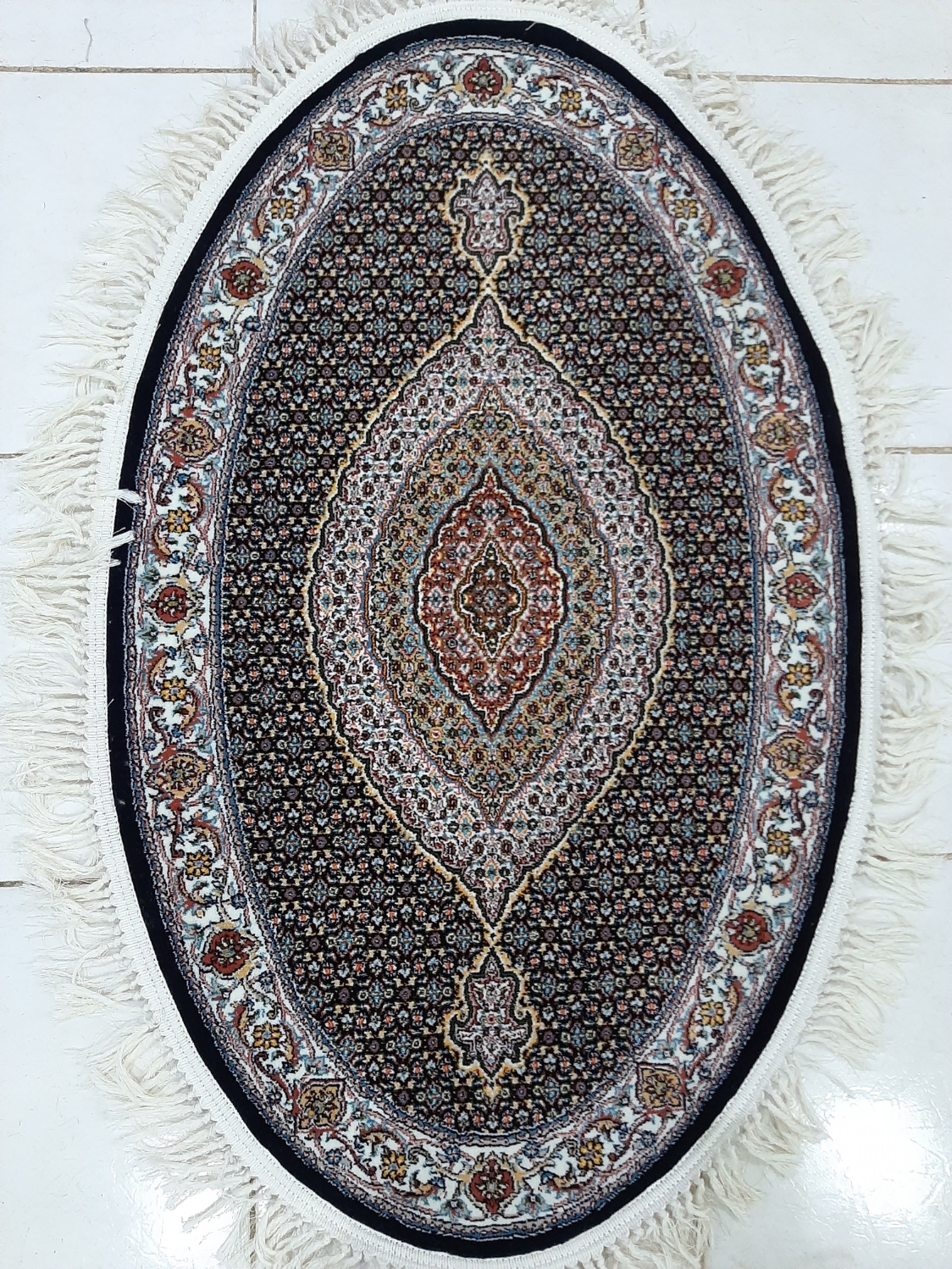 قالیچه بیضی فرش ماشینی یک متر در 1/5 متر بیضی 700 شانه اصل ریزماهی سرمه ای با تراکم 2100 صددرصد نخ اکرولیک هیت ست شده با 60 ماه ضمانت کیفیت، ارسال پس کرایه