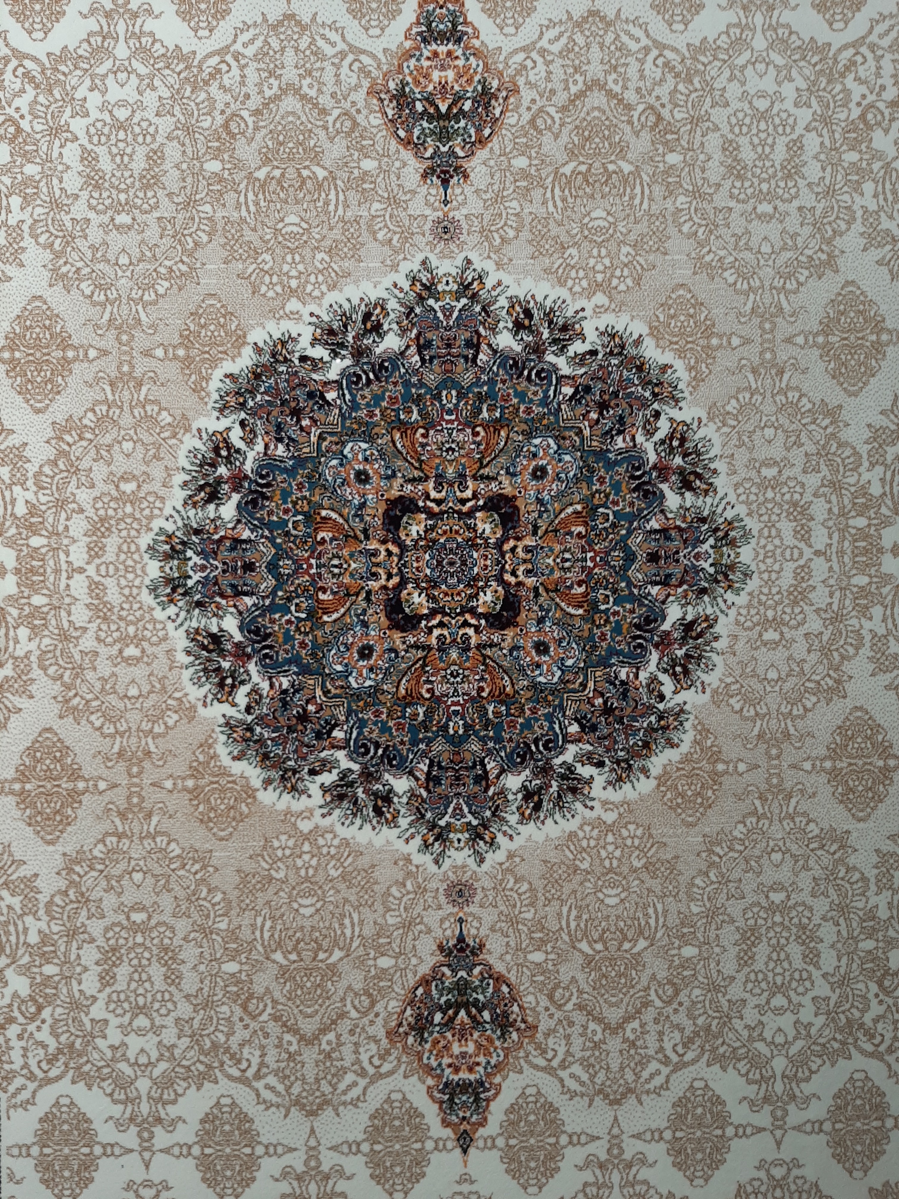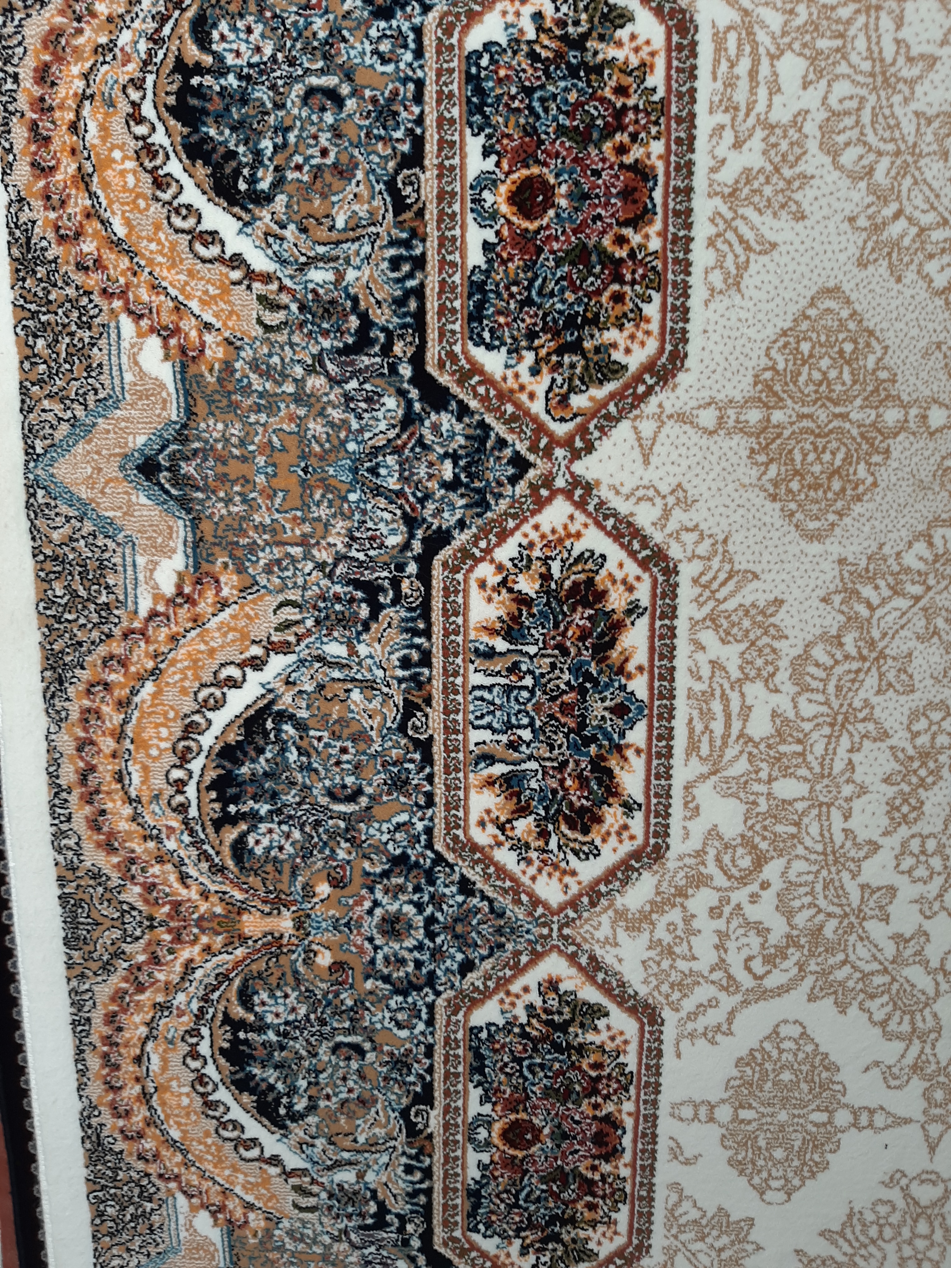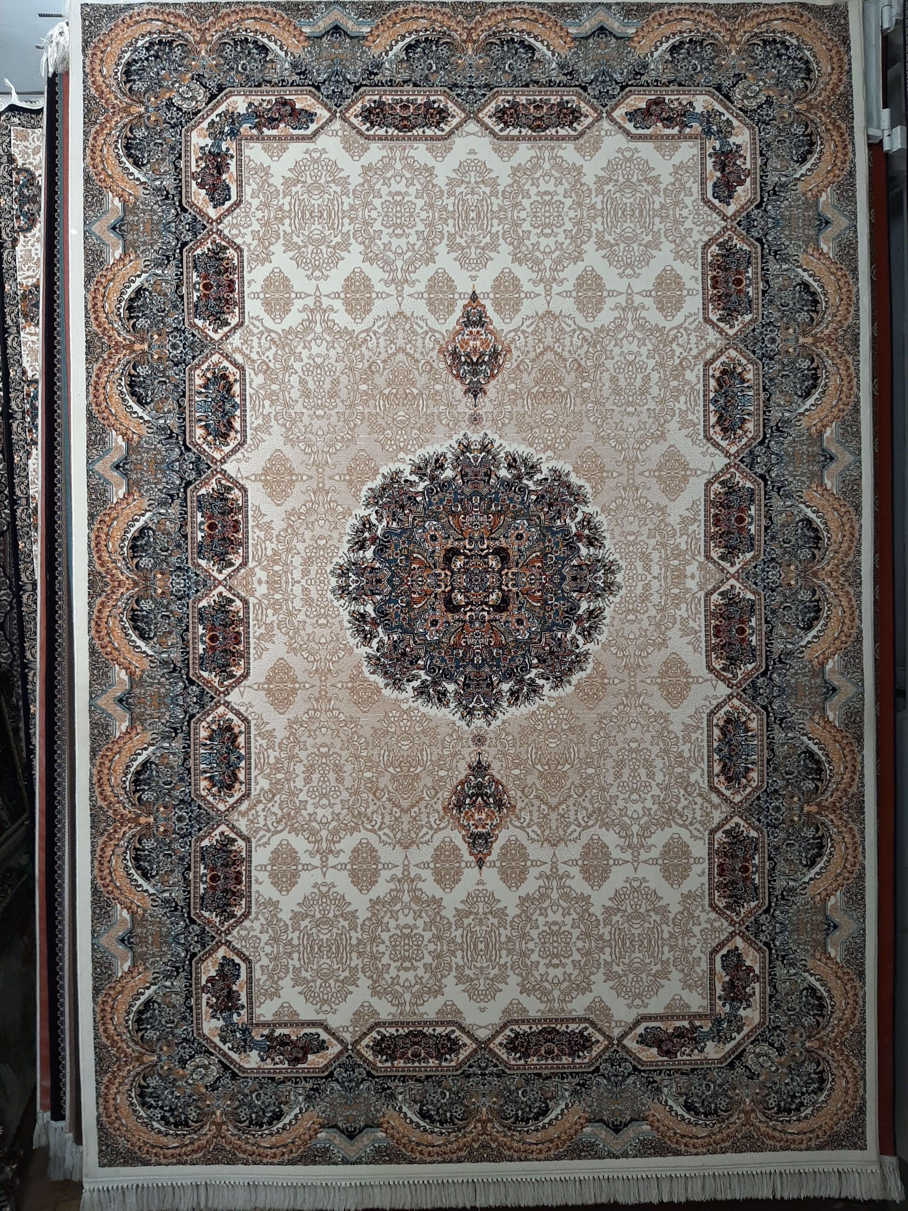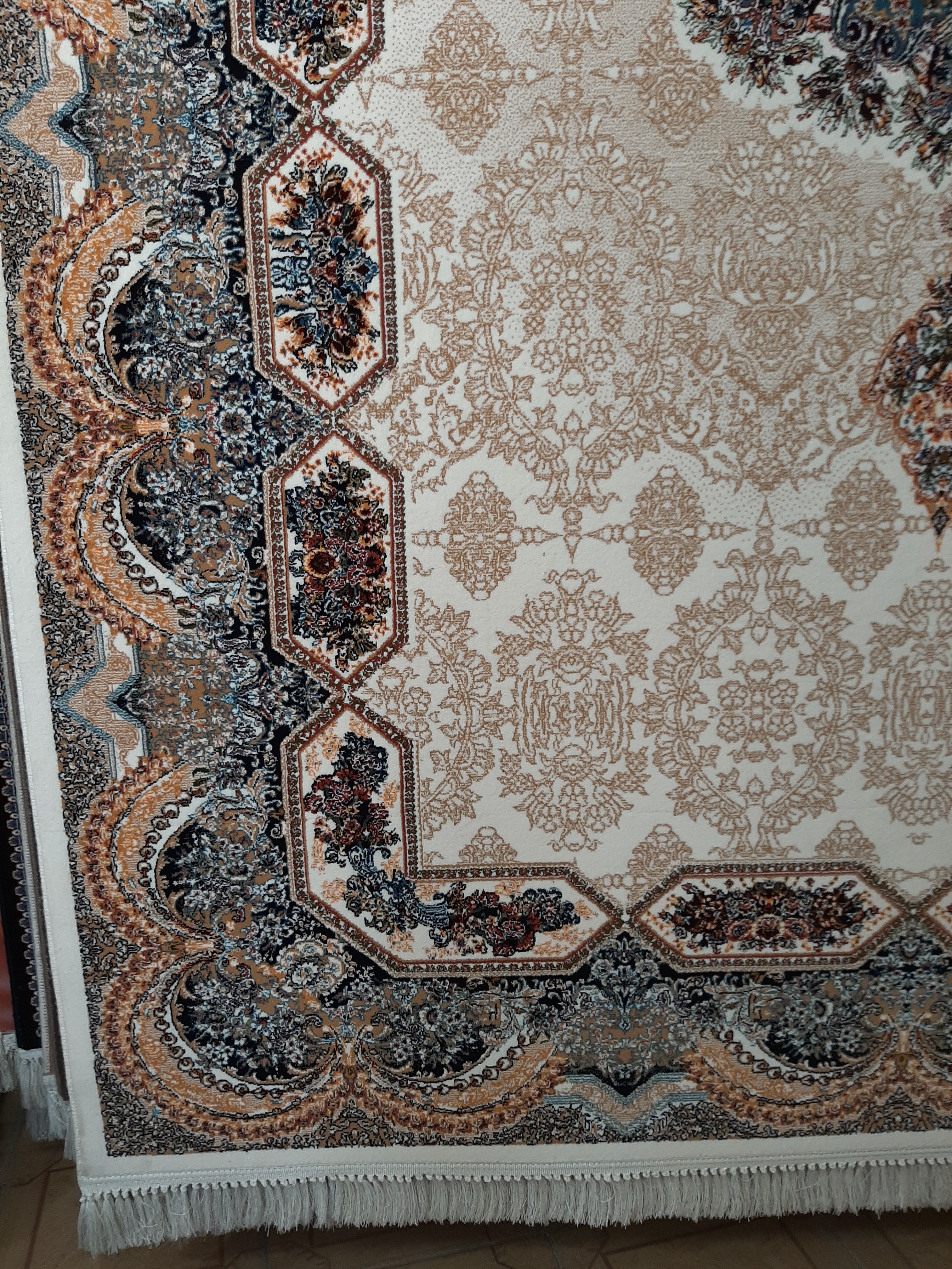فرش ماشینی ۷۰۰ شانه اصل نقشه هالیدی کرم هشت رنگ صددرصد نخ اکریلیک هیت ست شده با ۶۰ ماه ضمانت کیفیت و ضمانت مرجوعی کیفیت، بسیار باکیفیت، با ضمانت اتوی داغ، بافت با ۳ رنگ متنوع زمینه، فیلی - سرمه ای- کرم، ارسال پس کرایه